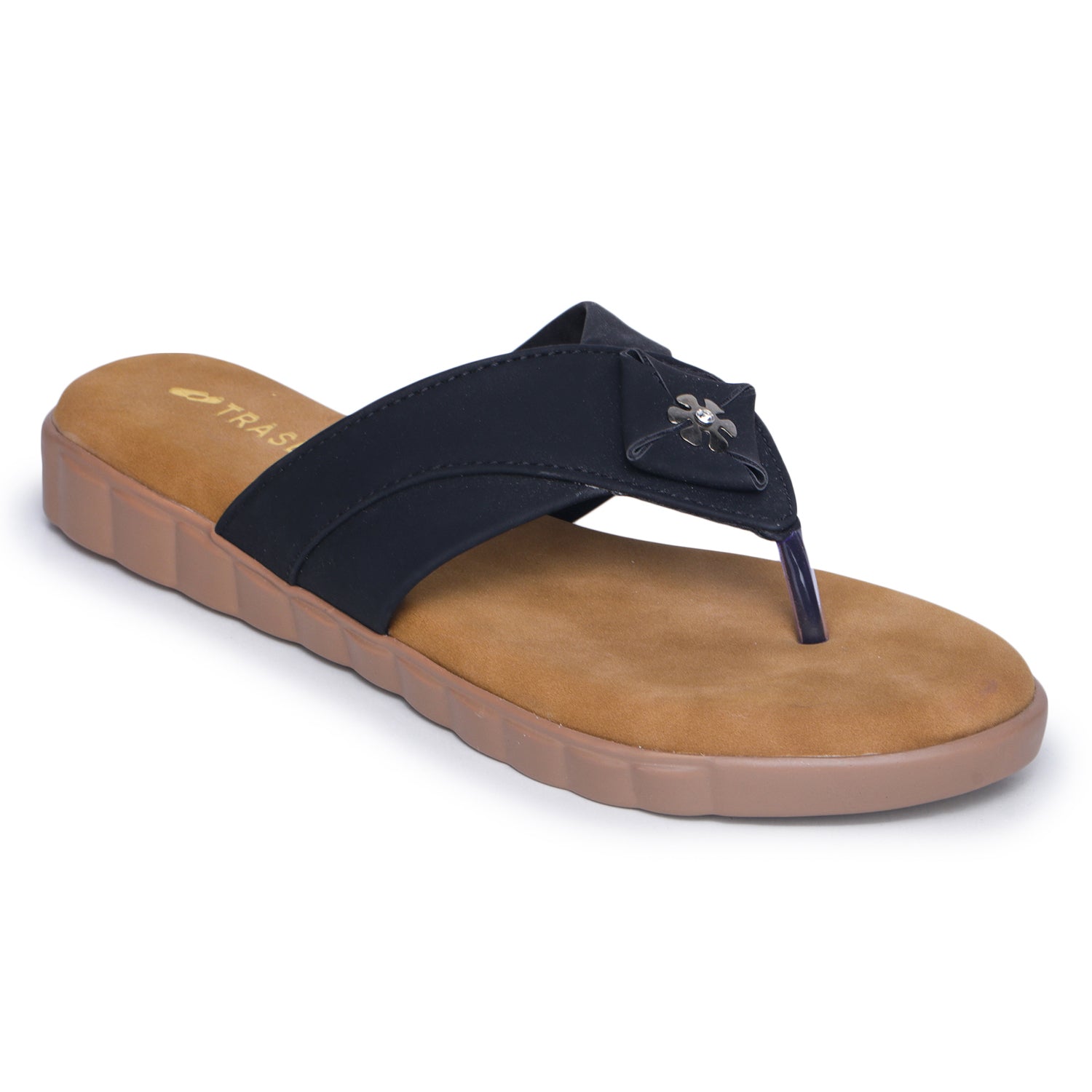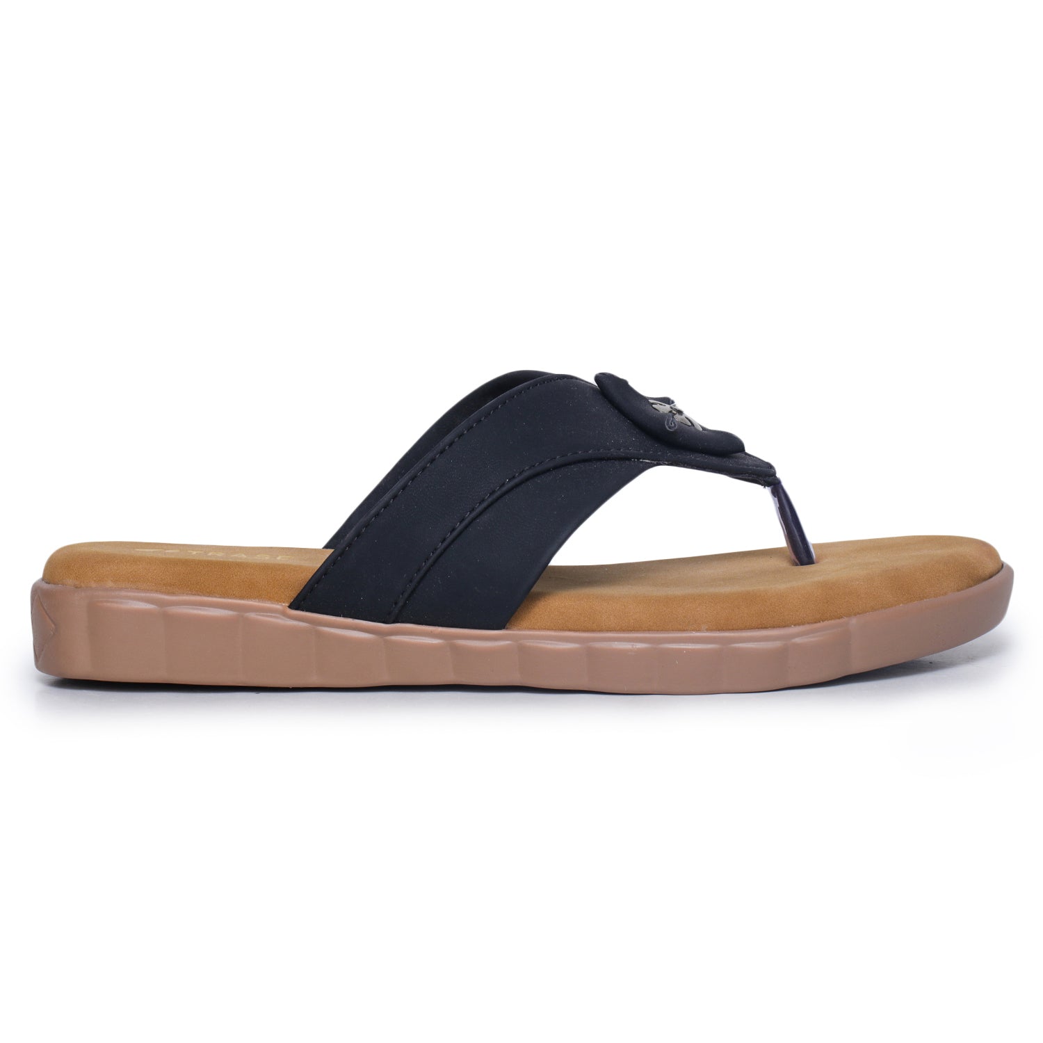 The Soft Toe Comfort Flat Sandal is designed for women who appreciate casual elegance. Featuring a delicate floral detail and a supportive V-strap, this sandal blends style with everyday comfort. The padded insole cushions your feet, while the grooved outsole ensures flexibility for natural movement. Perfect for running errands or relaxing, these flats provide reliable comfort with a fashionable touch.
